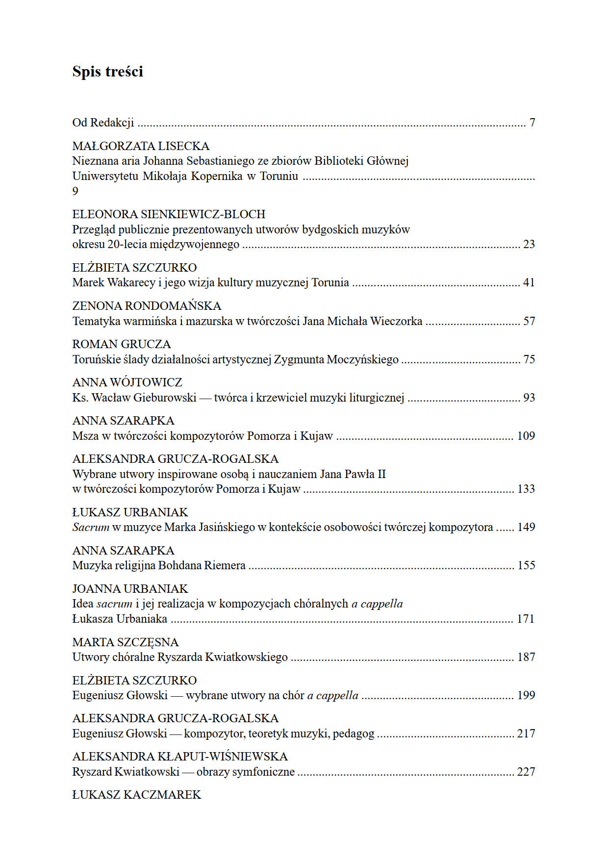 Tematyka została zogniskowana wokół kilku wiodących zagadnień. Największa część opracowań dotyczy muzyki chóralnej kompozytorów działających w regionie kujawsko-pomorskim (m.in. Eugeniusza Głowskiego, Marka Jasińskiego, Ryszarda Kwiatkowskiego, Bohdana Riemera, Łukasza Urbaniaka). Kilka spośród artykułów przybliża sylwetki poszczególnych twórców i ich dorobek, stanowiąc przyczynek do dalszych pogłębionych analiz. Co ciekawe, uwzględniono tutaj również kompozytorów muzyki popularnej, musicalowej i teatralnej (np. Zbigniewa Lachowicza, Stanisława Renza, Piotra Salabera). Kolejny obszar badań obejmuje prezentację dorobku artystycznego i organizatorskiego muzyków nieprofesjonalnych i animatorów życia muzycznego w regionie. Wreszcie ostatnia grupa tekstów została poświęcona muzyce ludowej. Tutaj warto zwrócić szczególną uwagę na obszerne opracowanie dotyczące działalności kapel kujawskich, które będzie kontynuowane w następnych publikacjach.