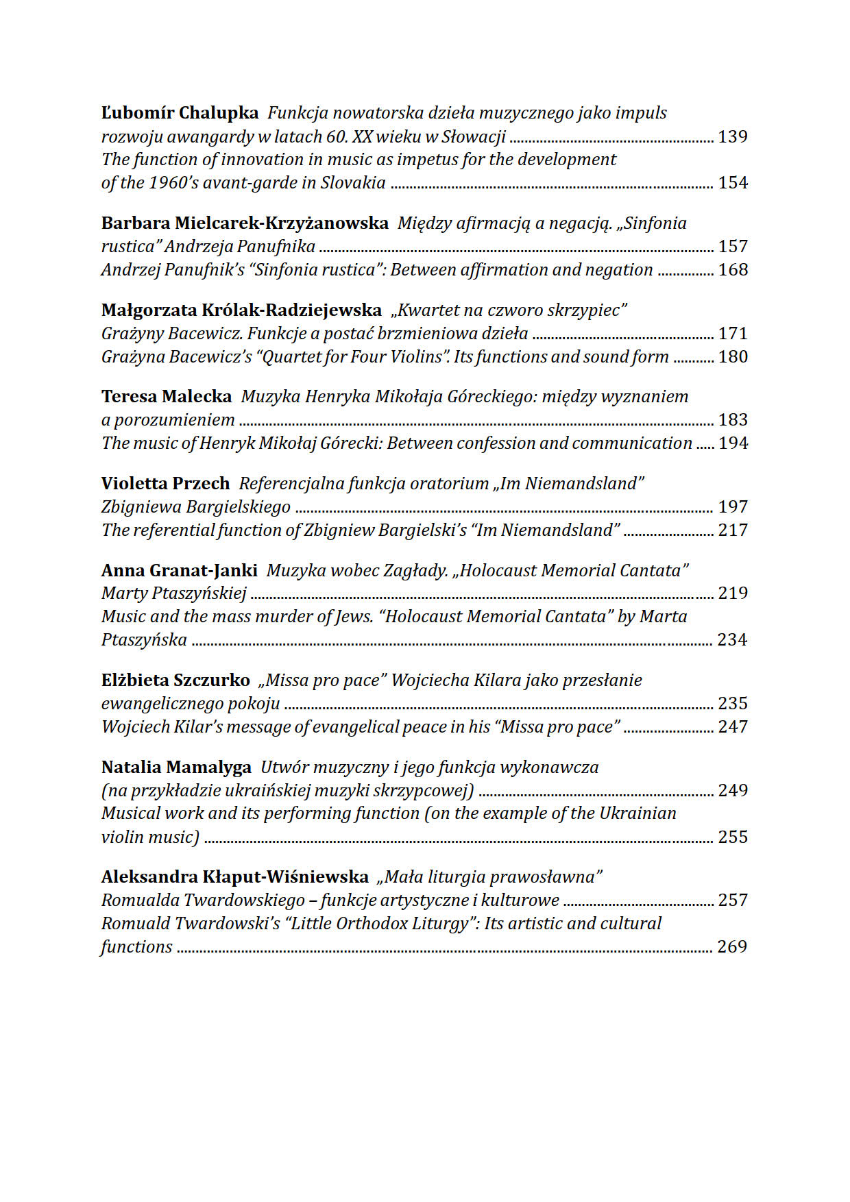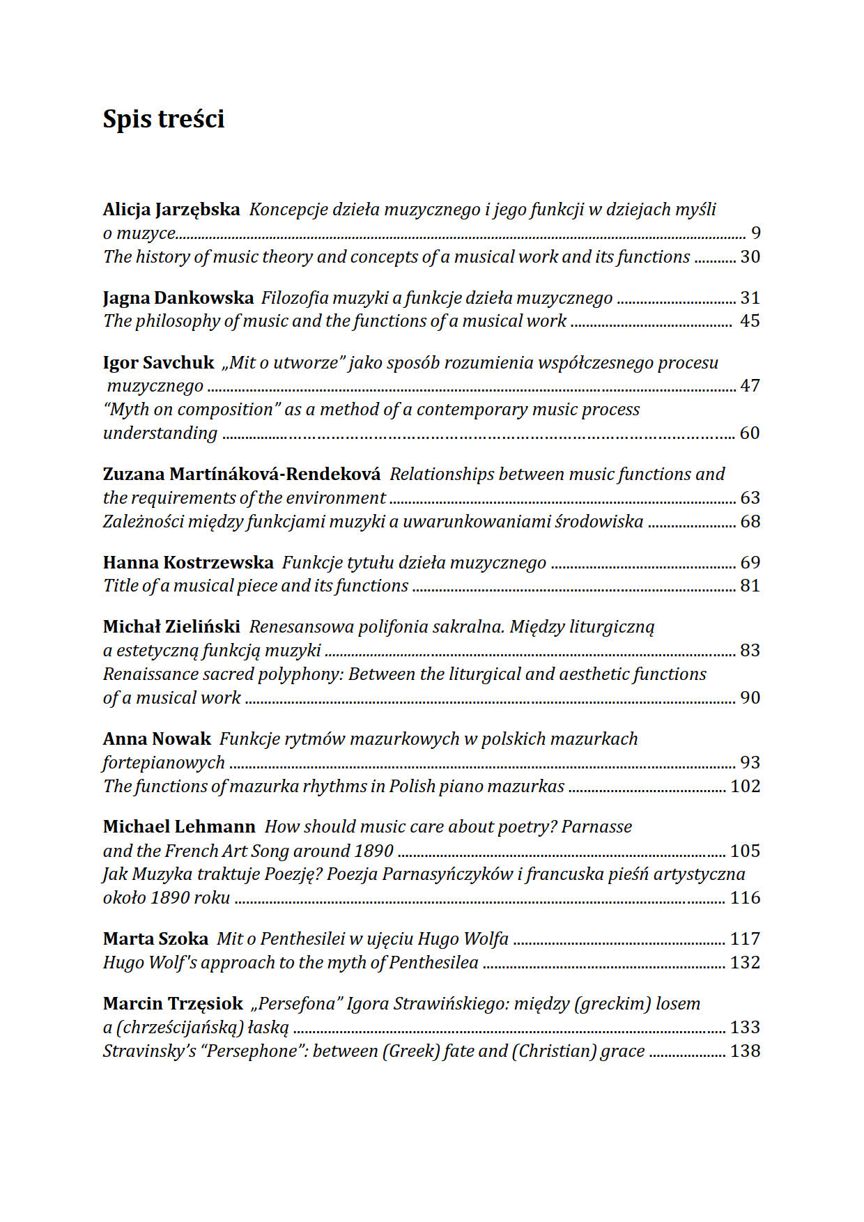 Dzieło muzyczne jako przedmiot estetyczny będący nośnikiem znaczeń i sensów o charakterze nie tylko autotelicznym, również referencyjnym wobec jego wewnętrznej logiczno-ekspresywnej spójni, pełni w kulturze wielorakie funkcje. Ich rodzaj i ważność w danym okresie historycznym oraz środowisku kulturowym ulegały przemianom wraz z determinującymi je czynnikami społecznymi oraz zmieniającymi się koncepcjami samego dzieła muzycznego. Opisanie tych procesów przyjęte zostało przez Autorów artykułów pomieszczonych w niniejszym tomie jako podstawowe zadanie realizowane w odniesieniu do przedmiotu badań badanymi metodami. Podejmując je, obierali oni najczęściej jedną z dwóch kompatybilnych względem siebie perspektyw ujęcia zagadnienia: pierwszą – poszukującą w strukturze dzieła muzycznego znaczeń i ustalającą jego funkcje kulturowe, wtórną na tworzenie prezentującą uwarunkowania środowiskowe wywierające wpływ na powstanie muzycznych artefaktów. Dyskurs naukowy, podjęty z tak spolaryzowanych stanowisk metodologicznych, zyskał w ten sposób szczególną intensywność, zachęcając Czytelnika szóstego tomu Dzieła muzycznego… do refleksji nad celami i funkcjami muzyki w przeszłości i współcześnie.