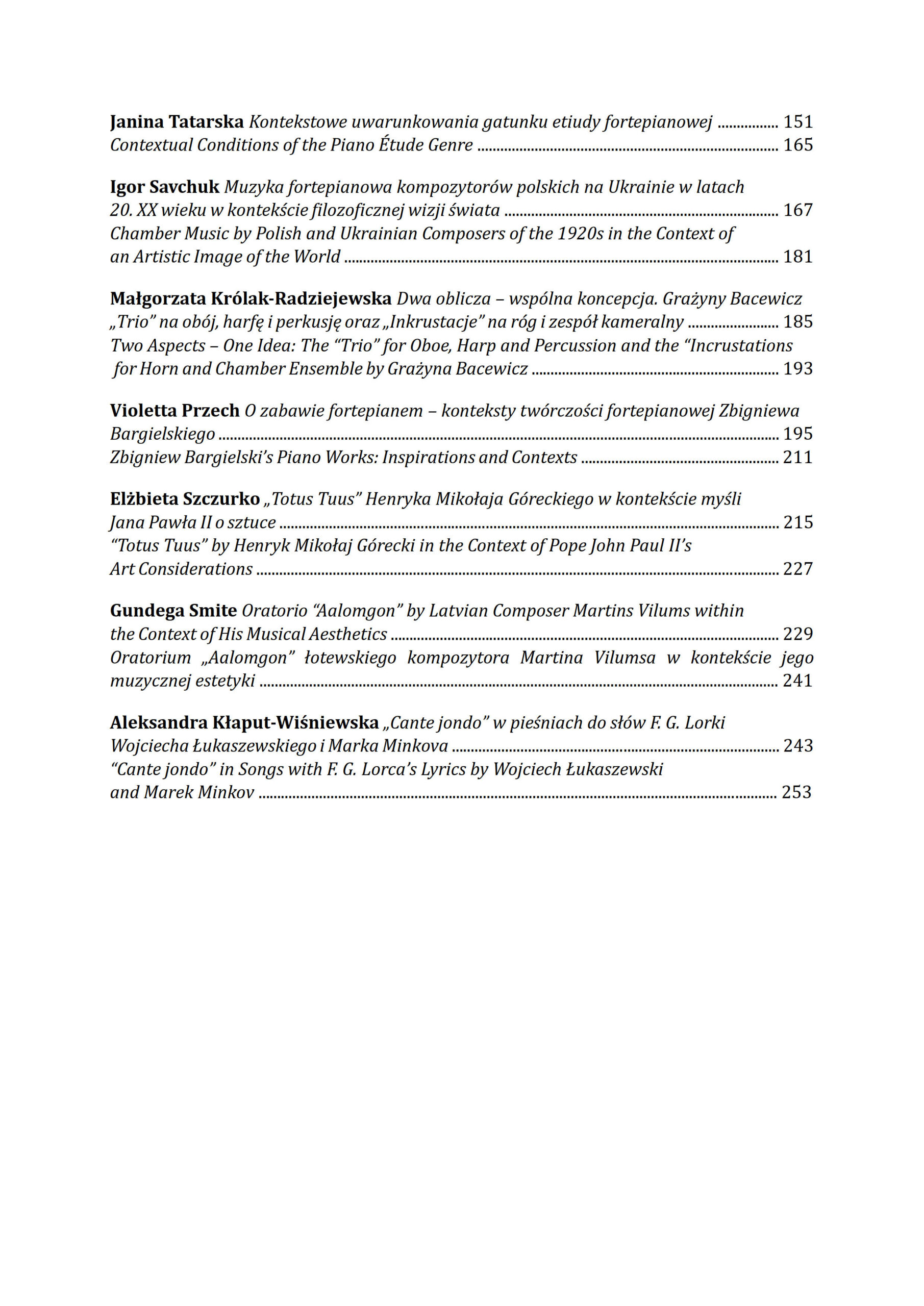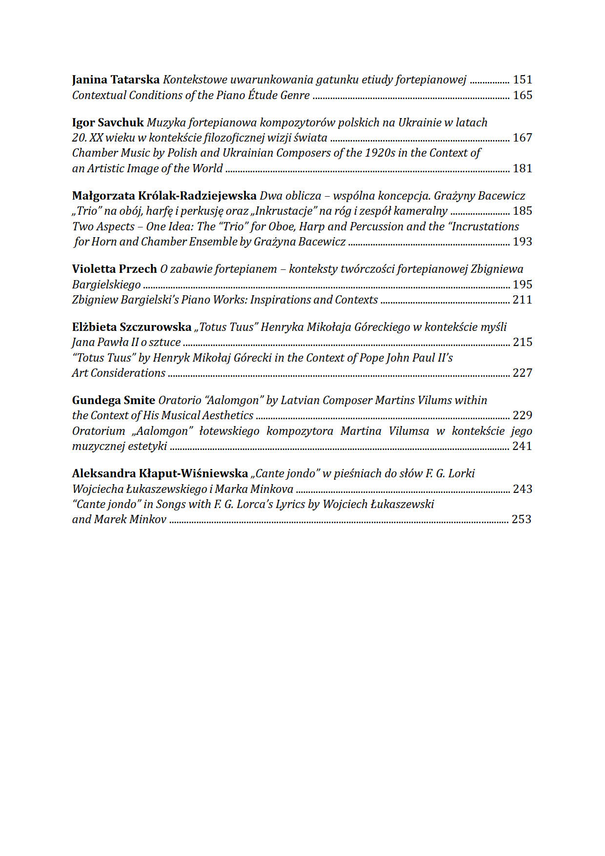 Pośród wielu możliwych ujęć zagadnienia kontekstualności dzieła, autorzy zebranych w tomie artykułów skupili uwagę na czterech obszarach badawczych odnoszących się do: [1] związków dzieła muzycznego z kulturą epoki, w której ono powstawało, zwłaszcza z jej ideami filozoficznymi, estetycznymi i teoriami naukowymi, [2] oddziaływania realiów historycznych epoki i [3] wpływu momentów biograficznych na dzieło muzyczne oraz [4] relacji intersemiotycznych dzieła muzycznego – jego związków z innymi utworami muzycznymi i literackimi. Wymienione wątki badawcze pozwalają problematykę twórczości muzycznej rozważać z różnych perspektyw metodologicznych, a zainteresowanemu Czytelnikowi proponują ogląd dzieła muzycznego w jego uwarunkowaniu historyczno-kulturowym.