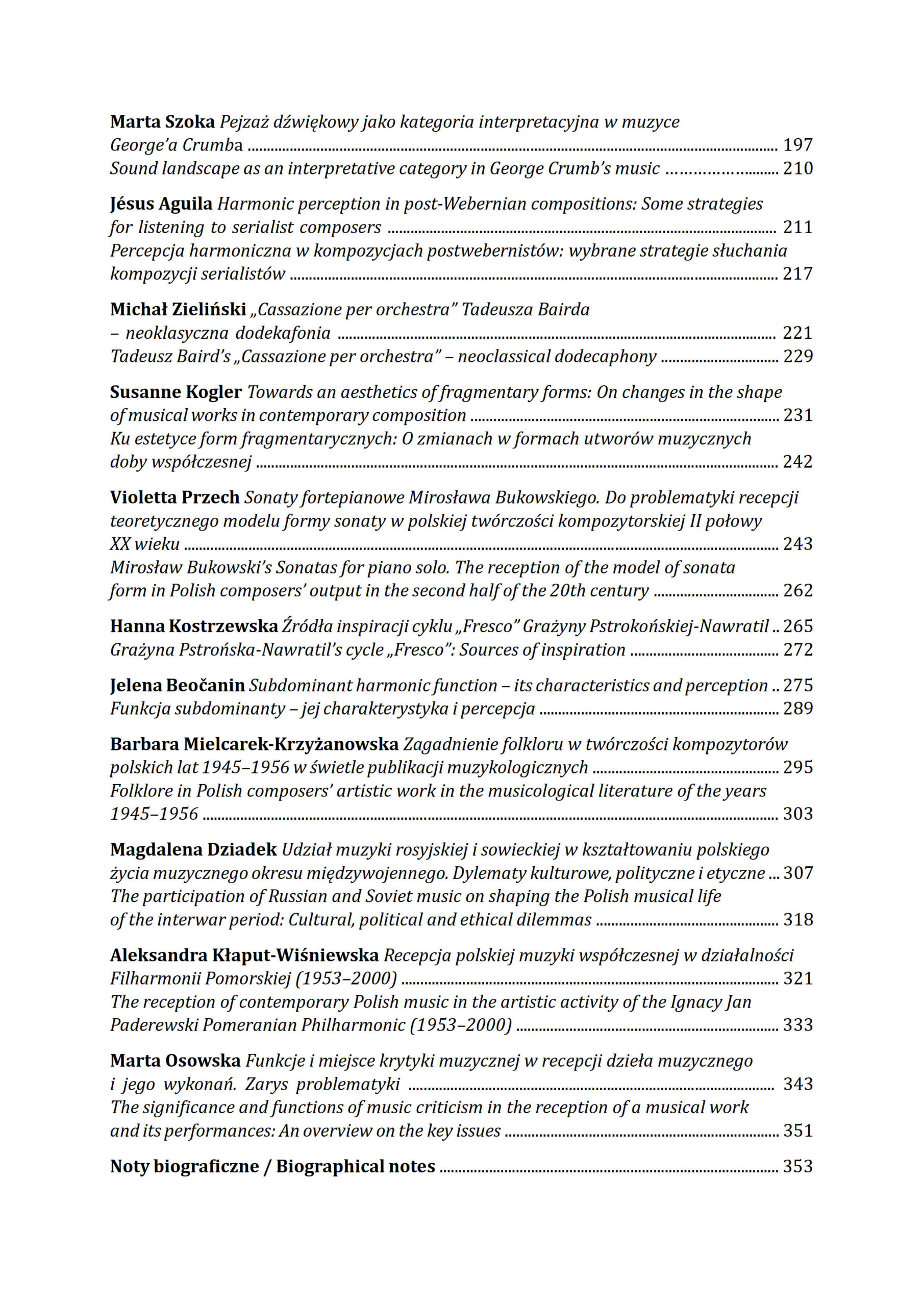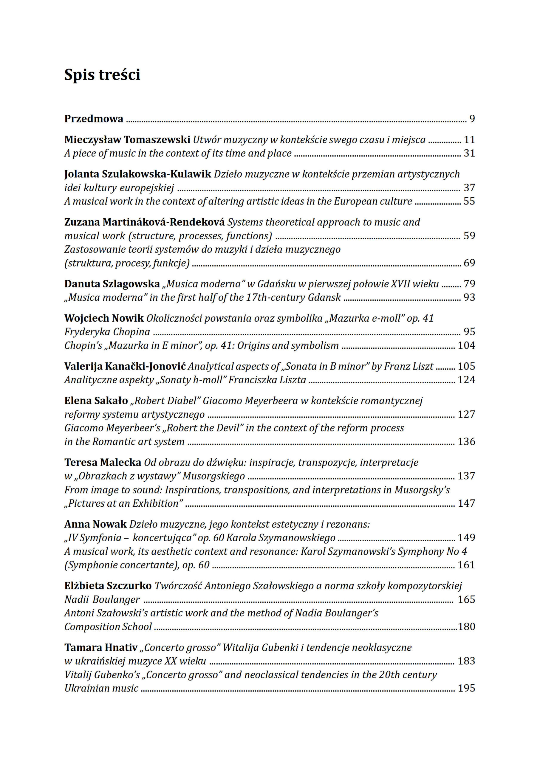 Prezentowane ujęcia generują szerokie spektrum postaw i strategii badawczych, co – gdy uwzględnimy rozpiętość czasową (od XVII wieku po czasy najnowsze) i problematykę szczegółową podejmowaną przez poszczególnych autorów – stanowi o różnorodności i wielości zaprezentowanych spojrzeń. Nie bez znaczenia jest również fakt, iż autorzy artykułów pochodzą z kilkunastu ośrodków akademickich kraju i Europy. Zindywidualizowane w przedmiocie i metodach opisu teksty łączy jednak cel nadrzędny – poszukiwanie sensów zawartych w dziele muzycznym i poprzez nie ewokowanych oraz dążenie do rozpoznania jego miejsca w przestrzeni kultury, relacji do muzyki czasu minionego, twórczości współczesnej i późniejszych generacji kompozytorskich.