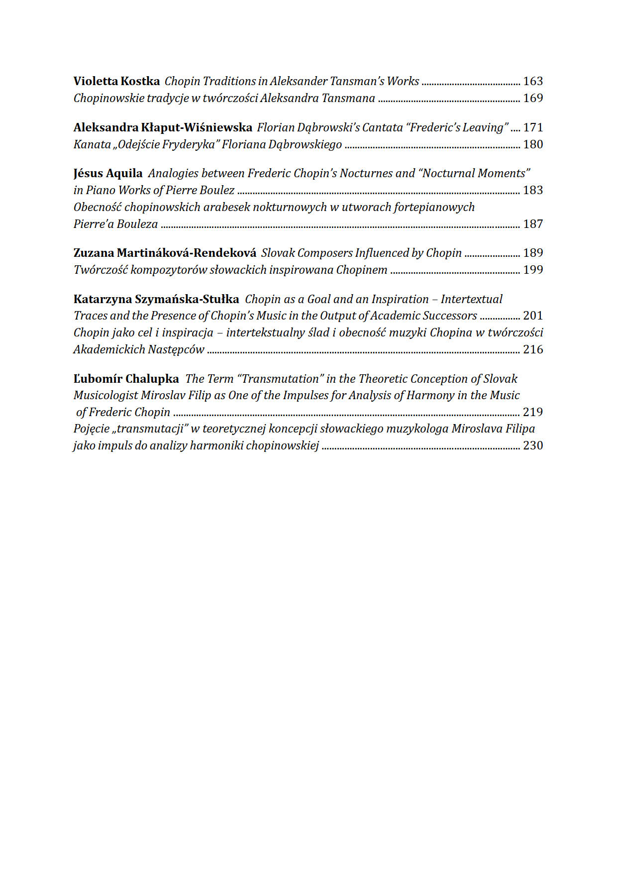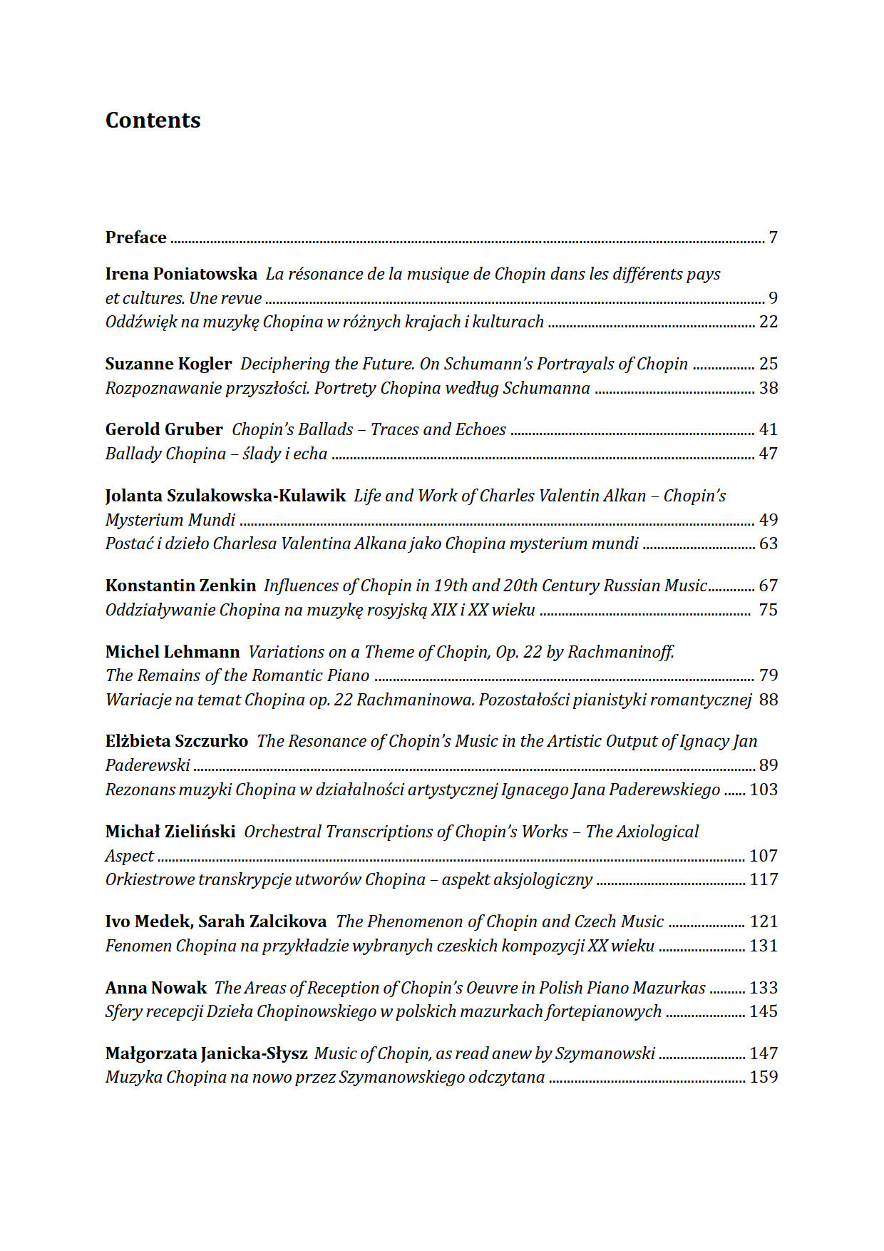 „200 years after the birth of Frederic Chopin, his music has overtaken all the continents, while a recording of the composer’s music was sent to a space station”. The above conclusion, made by the outstanding Polish Chopinologist, Professor Irena Poniatowska, is found in an article opening a collection of texts on the reception of Chopin’s art in Poland, Europe and all over the world over the past two centuries. Following the traces leading to and from Chopin’s oeuvre as well as the echoes of the ideas and values embodied in his music means having to cover various areas of musical culture: composition and its stylistic conditions, musical performance, musical criticism, and theoretical reflection. The authors of the articles, while describing the multiple forms of the radiating of Chopin’s music, focused their attention mainly on explaining the character of relations between his art and the music of the country they represent: Russia, Slovakia, Czech Republic, Austria, France, and Poland. Due to this fact, not only did the panorama of the topics discussed turn out to be wide and diverse, but also the forms of the resonating of Chopin’s heritage characteristic of particular environments did manifest themselves. Following them in individual articles may become a source of significant reflection as well as inspiration for further exploration of the chosen threads of Chopin’s reception.